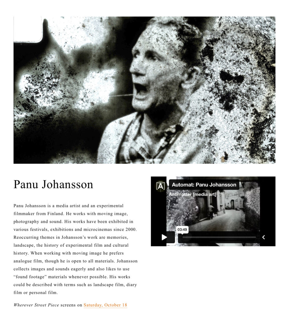 The Antimatter website also includes a section called “Automat”, where filmmakers can introduce themselves and their work. My video introduction of “Street Piece” is also included. See Automat here.